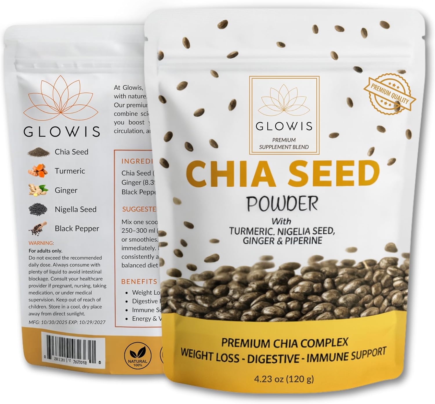 Discover the power of five functional superfoods — Chia, Turmeric, Ginger, Nigella, and Black Pepper — in one clean, nutrient-rich formula. This premium Chia Seed Powder supports energy, digestive health, immune function, and overall balance, helping you feel your best every day.