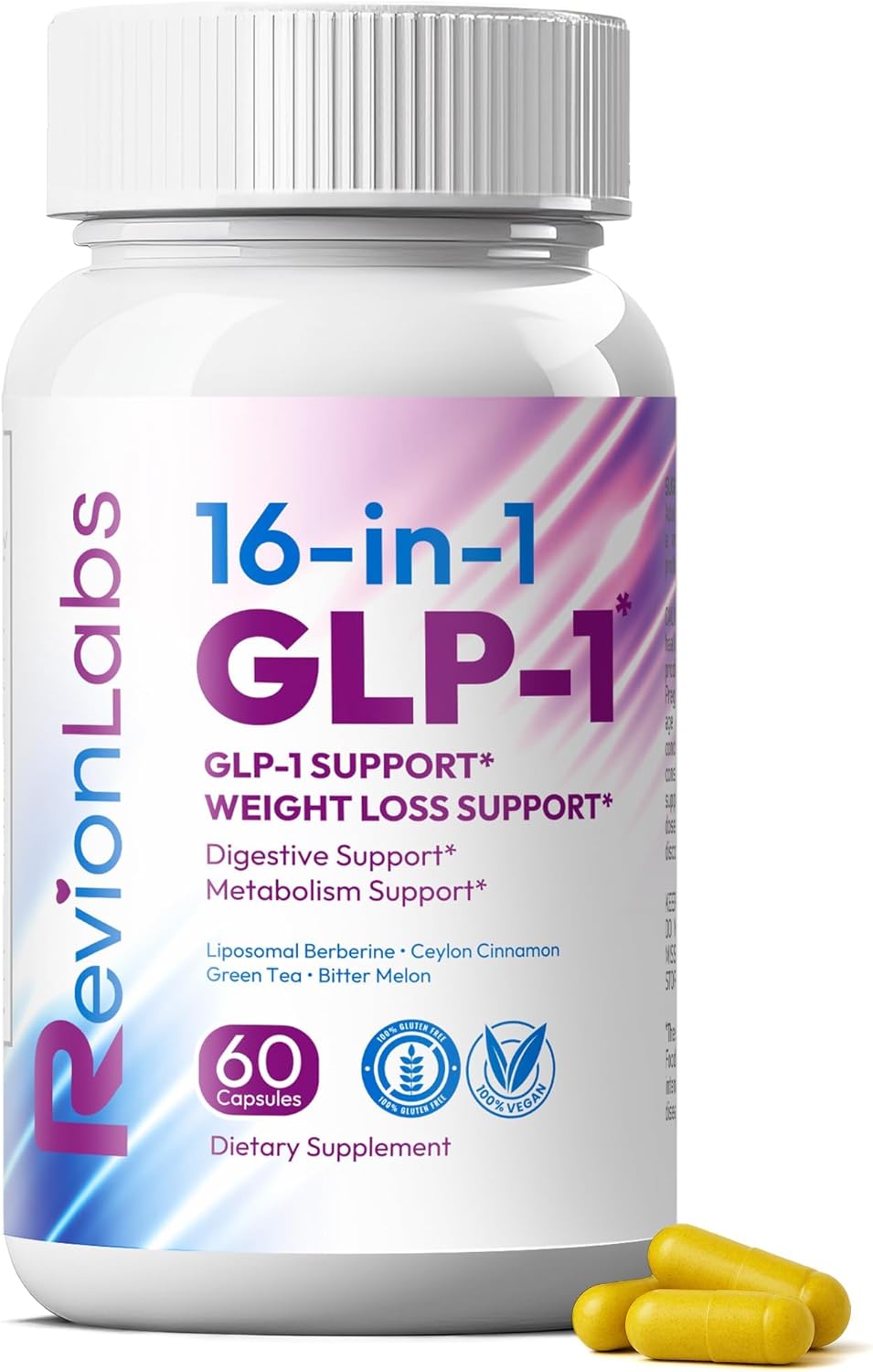 High-Absorption, 60-Capsule Supply: RevionLabs 16-in-1 GLP-1 Support uses a liposomal delivery system to enhance nutrient uptake and maximize benefits through convenient oral capsules. Each bottle contains 60 easy-to-swallow vegetable capsules, providing a full 30-day supply for consistent use. Simply take two capsules daily as part of your balanced routine. This vegan, non-GMO, gluten-free and sugar-free formula delivers versatile daily support, made without artificial colors or preservatives.
