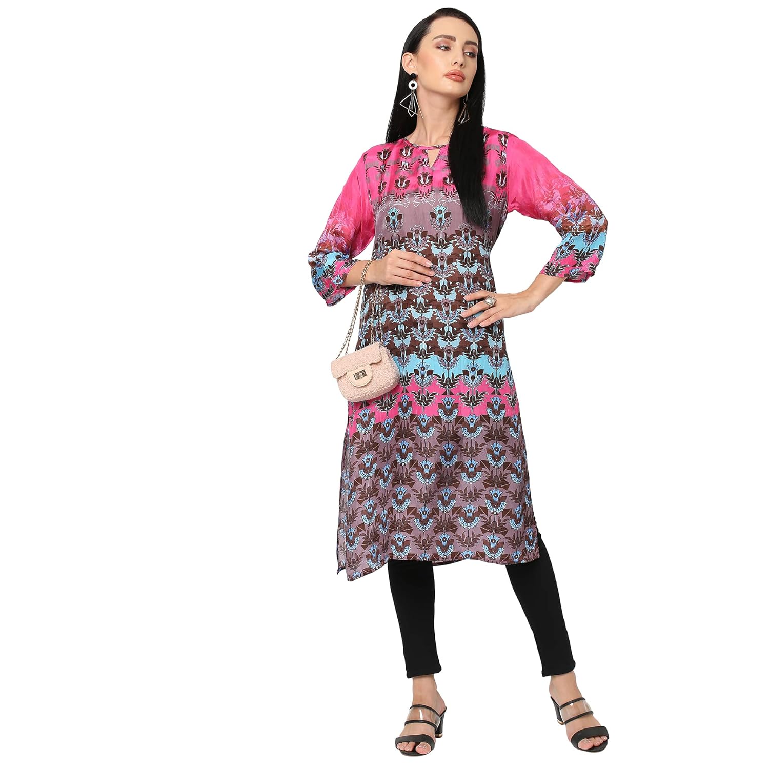 This knee-length kurta is made from 100% Viscose fabric which will give a nice look. It has a boat neck, three-quarter sleeves and side slits with overall floral print.